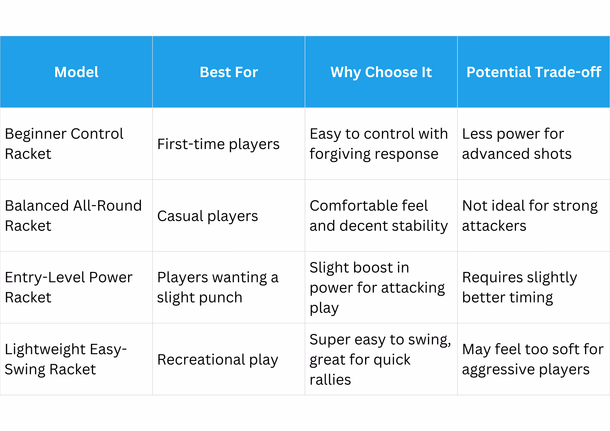 Budget rackets won’t give you the performance or feel of premium models. Instead, they offer control, forgiveness, and affordability — perfect for learning fundamentals and enjoying your first games.